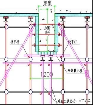 统一采用梁底增设一根立杆的搭设方式,梁宽方向间距(250+梁宽+250)根据梁宽尺寸进行调整,选用900、1200两种间距。沿梁跨方向立杆间距匹配满堂架立杆间距,间距450mm。两侧布置2~4排对拉螺杆。