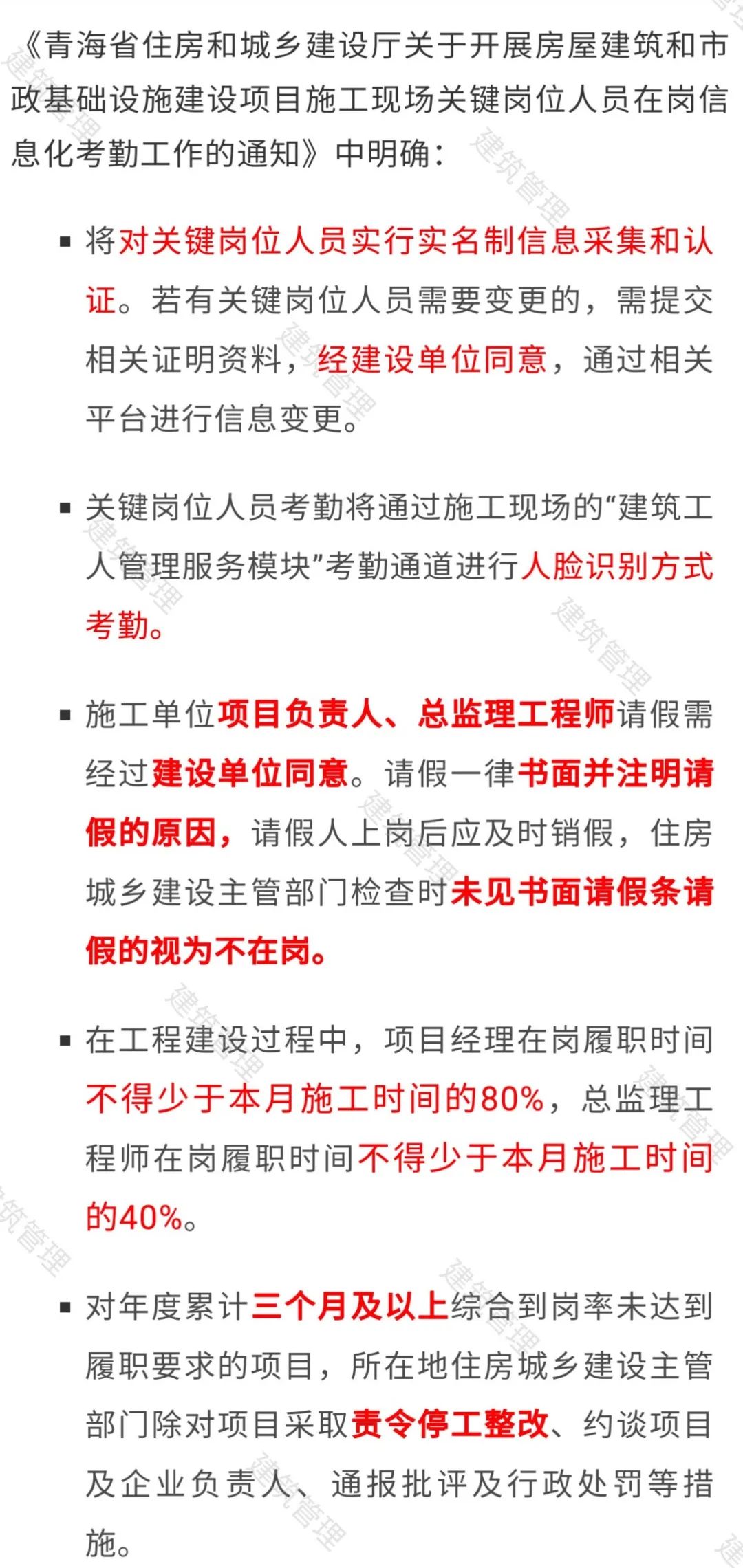 项目经理、总监未到岗,一律停工切断用电!够狠!项目经理、总监需每日两次人脸考勤,4小时以内无效!项目经理等须每天人脸识别考勤!全部实名登记!项目经理到岗率小于60%,按照未到岗月数,延后其招投标系统IC卡解锁时间