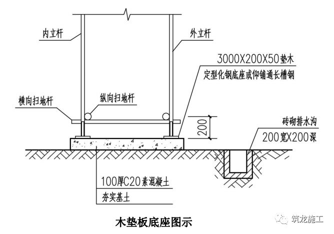 1. 落地式脚手架基础为回填土时,可采取两种做法,分别为12号槽钢底座和3000 mm×200 mm×50 mm木垫板底座。