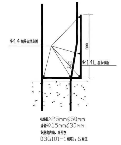 如果钢筋位移在 25mm 到 50mm 之间且向内偏,可直接在楼面上按 1:6 比例调整钢筋,保证模板支设,同时采取钢筋根部绑扎和点焊钢筋的方法进行加固,加筋的直径为 14,加筋需要与打弯的钢筋绑扎搭接在一起。