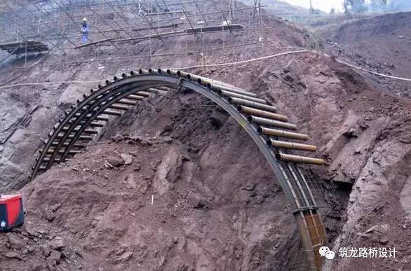 钢拱架放好之后,那些两根拱架之间的空隙要放钢筋网片,焊接好,侧向也要打入锚杆。之后,就要喷射混凝土了。如下图: