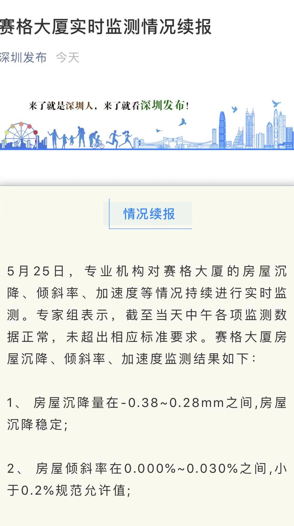 5月25日下午,“深圳发布”发布赛格大厦实时监测情况续报。据悉,专业机构已完成大楼整体结构体系建模和复核验算,认为结构整体性能满足要求。