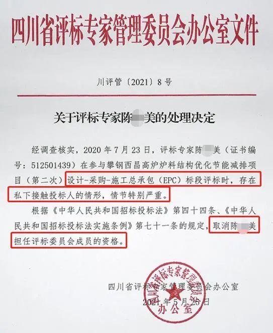 1名评标专家在EPC标段评标时,存在私下接触投标人的情形,情节特别严重。被取消担任评标委员会成员的资格。