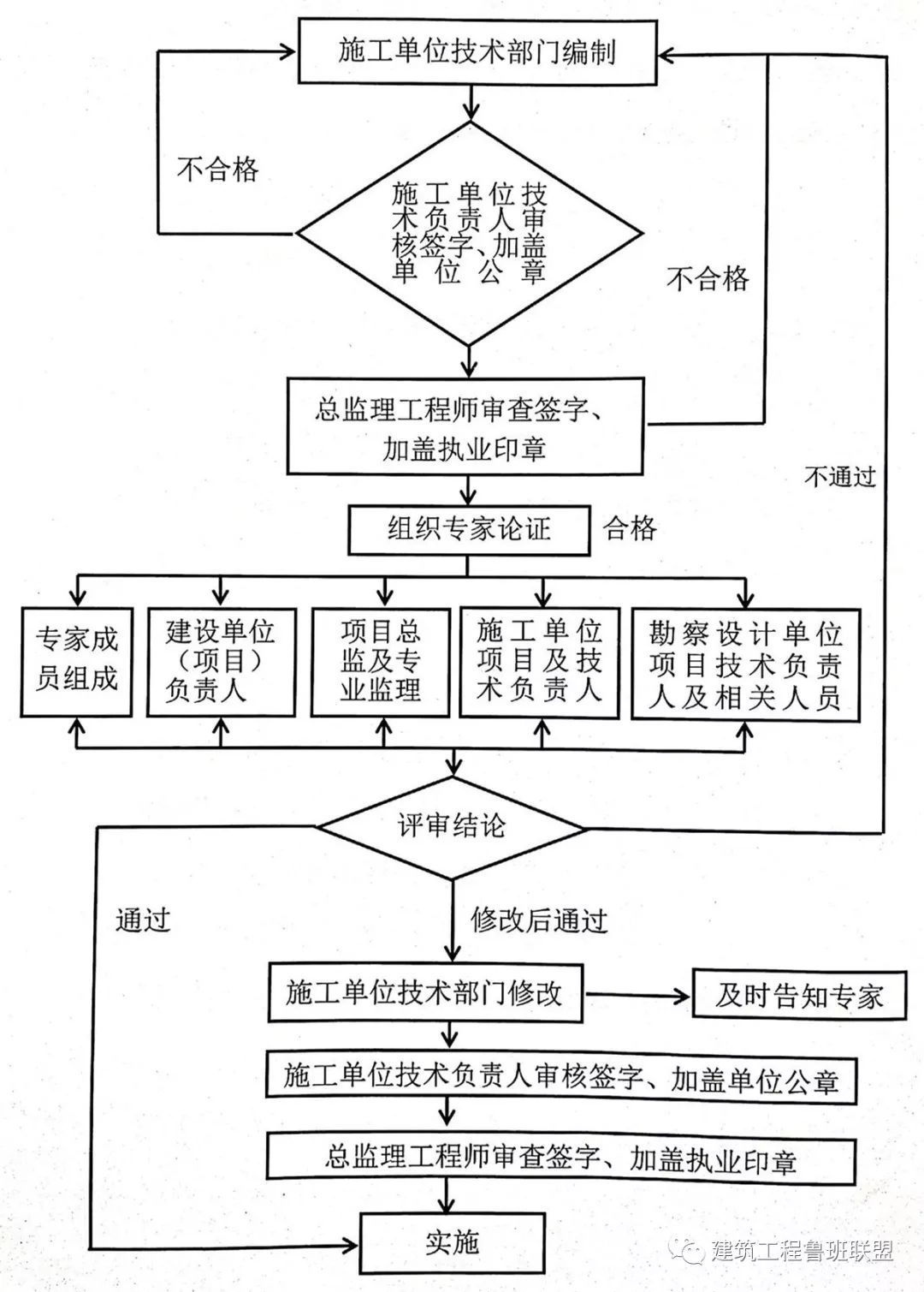 专项施工方案经论证需修改后通过的,施工单位应当根据论证报告修改完善后,专项施工方案应当由施工单位技术负责人审核签字、加盖单位公章,并由总监理工程师审查签字、加盖执业印章后方可实施。