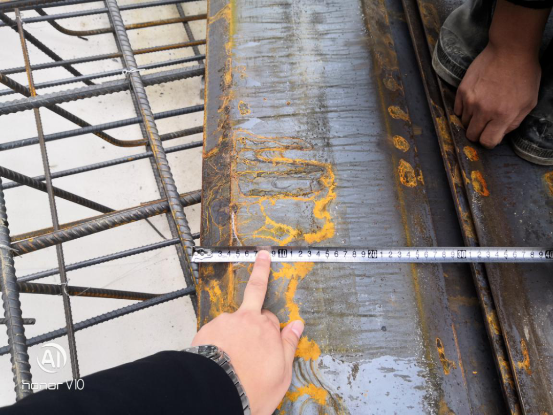 (2)钢板搭接方式:规范要求钢板搭接不小于20mm,双面满焊,为保证钢板焊接质量,本工程钢板双面搭接焊接长度为150mm。