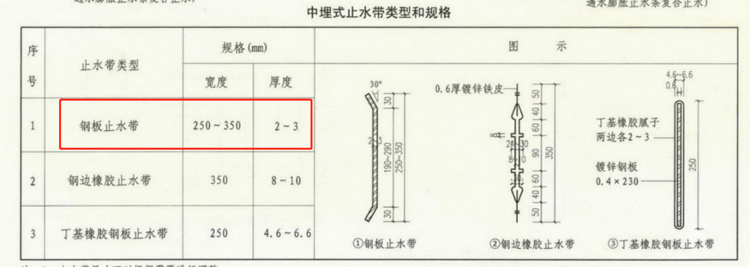 《地下建筑防水构造图集》10J301对钢板止水带明确了规格要求: