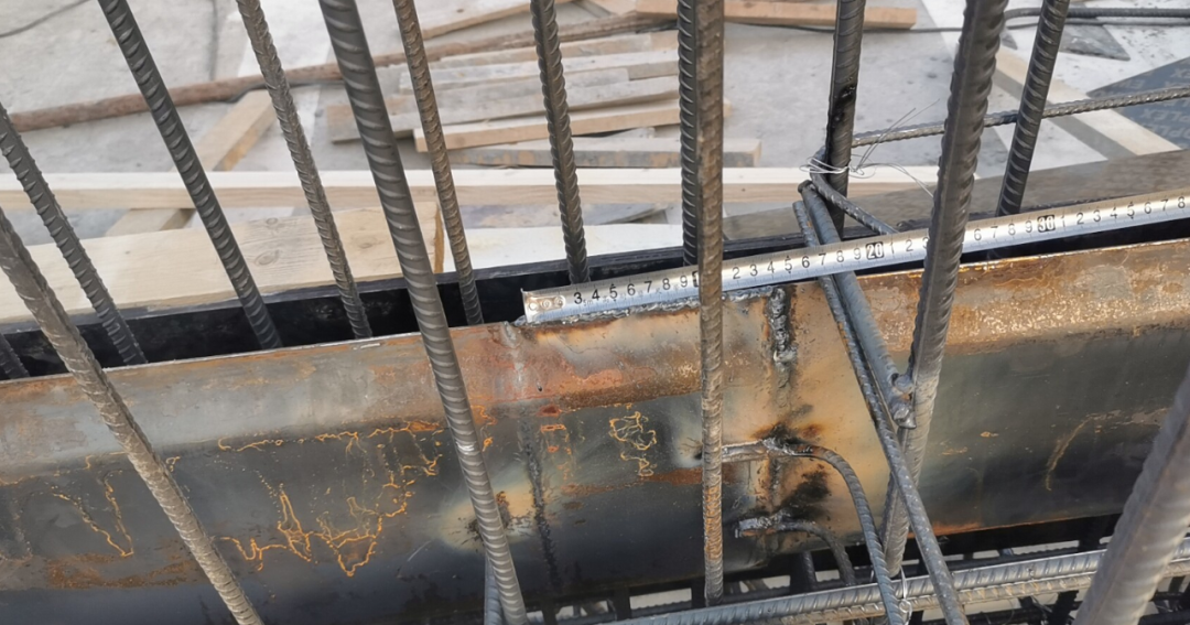 (3)钢板固定措施:钢板就位调整好垂直度后将上口点焊在水平定位筋,并将中部限位筋(原已焊牢在钢板上)与外墙立筋点焊牢固,现场采用φ12@600。