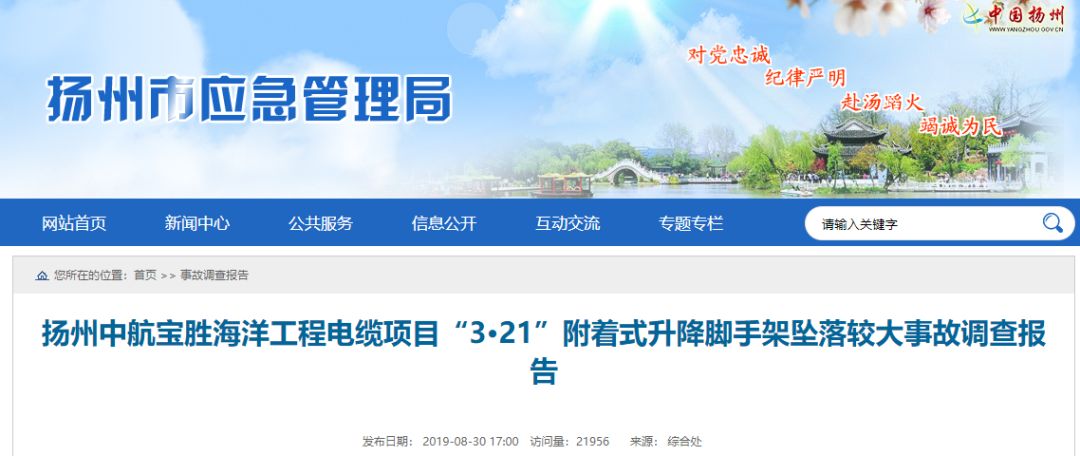 2019年3月21日13时10分左右,扬州经济技术开发区的中航宝胜海洋电缆工程项目101a号交联立塔东北角16.5-19层处附着式升降脚手架下降作业时发生坠落,坠落过程中与交联立塔底部的落地式脚手架相撞,造成7人死亡、4人受伤。