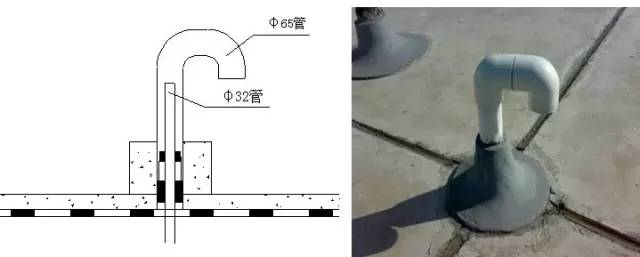 当原预留的排气管受到污染或破坏时,可采用管外套管的方式进行补救。套管应套在内管卷起防水卷材的外侧,并向下埋入屋面面层内。
