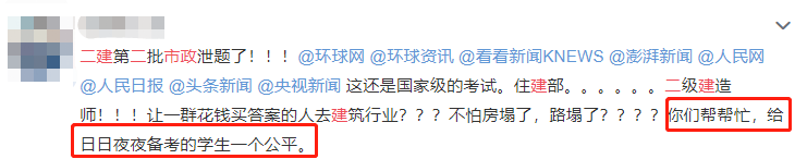 第二批二建全国卷考试结束后,市政被爆泄题。从之前网上流传出来的照片看,不仅试题泄露,连答案都写得清清楚楚!另据甘肃省人社厅网站消息,就此次泄题事件,住建部注册中心已向公安部报案。 信件标题:2021年第二批二级建造师市政泄题事件 信件内容:请问:今年我省二建考试已完毕,但刚考完试,网络上已经出现大量关于市政专业泄题的信息,关于此事,个别省已发文彻查,我省也与此次泄题事件有关,为何这么久了仍不见官方有任何积极的响应。 回复内容:考生您好!我省2021年二级建造师考试于5月29、30日顺利举行。您反应的有关工程管理与实务市政公用科目有疑似泄题情况,因二级建造师考试试题为全国统考卷,考试结束后,部分省份报告都有疑似泄题情况。我厅对此次事件高度重视,立即将疑似泄题情况向住建部注册中心报告,据悉住建部注册中心已向公安部报案。我厅将密切关注该案件进展情况,同时进一步加强我省考试安全风险防控,努力为每个考生营造一个公平公正的考试环境。感谢您对我们工作的关心与支持! 回复时间:2021-06-15 5月30日上午9点,18个省份选择市政专业的考生参加了第二批二建实务的考试。当天下午1点左右,有网友发博称二建市政泄题。之后,又有网友发布多个疑似泄题视频。疑似泄题群有3个,群成员最多的有2768人。 当天,相关话题一度冲上微博热搜。 正观新闻记者从视频中了解到,上午7点23分,疑似二建市政试卷答案在一个有64人的群聊里面发布。发布答案的群成员还特意叮嘱考生:“大家直接记忆。” 8点37分,在一个2768人的qq群中,二建市政考试部分选择题答案已经被发布出来。“我8点55发全部答案。”qq群中的发布者说道。 距离二建市政考试的前一天,在另外一个489人的二建考试群中,管理员就建议群里考生将该群置顶,并告诉群成员:“考试开始25分钟左右,在本群开始发答案,考试结束前一个小时发完。满意的话,就索要支付宝微信,进入第二科。”从聊天记录来看,《建设工程法规及相关知识》的考试答案也疑似遭到了泄漏。 据了解,二建第二批次考试时间为5月29日、30日,参加考试的省份有:上海、河北、山西、辽宁、江苏、浙江、安徽、福建、江西、山东、湖北、湖南、广西、重庆、甘肃、青海、新疆、陕西。 据正观新闻,6月1日上午,住建部相关工作人员表示:“虽然出题方是住建部,但监管方是组织考试的部门。目前该工作人员已经把举报材料整合,并提交给领导审核。” 据了解,疑似泄题的2768人qq群,目前人数已经达到了2999人,其中湖北省的人数为1137人,广东省的138人,江苏省101人。 湖北省人事考试院表示:“目前正在进行自查。”另一个工作人员表示:“目前我们已经将考生举报内容进行上报,到时候等待国家相关部门公布调查结果。” 广东省人事考试院表示:“并没有收到相关举报材料。” 考试本应是件很公平的事,各位通过自己的努力取得证书实属不易。如果有人仅仅考前背答案,就可以拿得证书,那对广大考生实在是有失公正。 这不禁让人回想起2017年一建泄题事件。 命题组专家,因泄题被抓 法制日报《公安机关侦破多起一级建造师“助考”案》一文披露: 2017一建泄题案的源头为命题组专家王某,其利用参加命题工作之机非法窃取命题信息,通过中间人提供给“助考”培训机构。 据了解,王学军自2004年起参加一级建造师执业资格考试命题工作。2017年7月,另一被告人翁其能提出、授意王学军利用参加命题便利,获取非其出题的市政专业试题、答案,由其在培训机构中讲课使用,并约定四六分成。 同月8日至16日,王学军利用参加命题的便利,在命题现场通过浏览打字员电脑中市政等专业的考卷的方式,对关键词、知识点等进行记忆,于休息时间通过回忆,结合自己的专业知识和出题经验,将所获取的市政等专业的考卷内容整理在随身携带的笔记本电脑上,后在教材上对照电脑中整理的内容进行勾划、标注。 翁其能在王学军住处,在自带教材上进行对照勾划、标注和补充。 事后王学军从翁其能处获取120万元。 9月3日,最高人民法院发布了上述考试作弊犯罪典型案例,同时明确非法获取属于国家秘密的试题、答案,而后向他人非法出售、提供试题、答案,应当数罪并罚。 江苏省南通市如东县人民法院判决认为,被告人王学军作为命题组成员,受被告人翁其能的授意,非法获取属于国家秘密的试题、答案,并提供给翁其能在对外培训中使用获利。 被告人王学军、翁其能构成非法获取国家秘密罪和非法出售、提供试题、答案罪,数罪并罚,对王学军决定执行有期徒刑五年六个月,并处罚金人民币一百五十万元; 对翁其能决定执行有期徒刑五年三个月,并处罚金人民币一百二十万元。 被告人翁学荣、许智勇等8人构成非法出售、提供试题、答案罪,综合考虑案件情况,分别判处有期徒刑三年三个月到八个月不等,并处罚金;对被告人刘伟、王辉、洪奕轩、洪浩、刘向阳、江莉依法宣告缓刑。 泄题后,考生成绩怎么处理? 问题已查清,但是身后还有一堆烂摊子。大家都很关心:2017年一建成绩到底如何处理呢? 各省人事考试部门陆续公布了处理意见。 浙江:126名考生成绩作废! 2018年1月22日,浙江人事考试网率先公布对2017一建雷同卷的处理公告,126名考生的考试成绩作废! 原文链接:http://www.zjks.com/showInfo/Info.aspx?id=5817 上海:51人成绩无