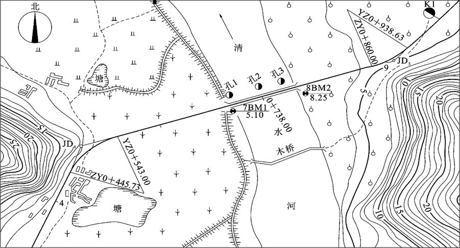 桥位平面图是通过地形测量绘出桥位处的道路、河流、水准点、钻孔及附近的地形和地物,以便作为桥梁设计、施工定位的依据。其作用是表示桥梁与路线所连接的平面位置,以及桥位处的地形、地物等情况,其图示方法与路线平面图相同,只是所用的比例较大。如图11-6所示,为某桥的桥位平面图。