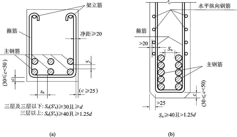 图11-18 梁内钢筋净距(单位:mm)