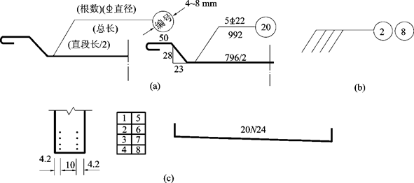 对钢筋编号时,宜先编主、次部位的主筋,后编主、次部位的构造筋。在桥梁构件中,钢筋编号及尺寸标注的一般格式如下: