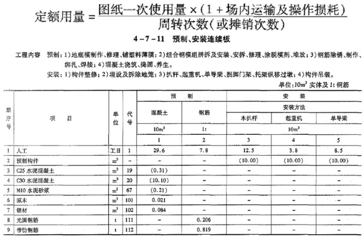 中(粗)砂=0.46*(1+1%)*10=4.65m3材料基本定额合理条件下,为生产单位数量半产品、中间产品所规定的各种基本原材料的(工、料、机、费用等)消耗量标准。1)分析分项工程或半成品所需人工、材料、机械的消耗量。某跨径为6m的实体式轻型墩台,混凝土设计强度等级为C25,试确定混凝土组成材料的预算定额。32.5级水泥=0.335*10.2=3.417t(3.040t)中砂=0.48*10.2=4.90m3(5.00m3)碎石(100px)=0.83*10.2=8.47m3(8.57m3)预制某矩形板,跨径为8m,砂浆设计强度等级为M15,试确定水泥混凝土及砂浆组成材料的预算定额。水泥:0.377*10.10+0.37*0.393=3.953t(3.927t)中(粗)砂=0.46*10.10+1.07*0.37=4.8m3(5.04m3)材料周转定额规定了周转性材料在施工中合理使用的周转或摊销的次数。定额用量是指周转性材料每周转使用一次应承担的摊销数量。《预算定额》总说明第八条规定:“本定额中周转性的材料、模板、支撑、脚手杆、脚手板和档土板等的数量,已考虑了材料的正常周转次数并计入定额内。其中就地浇筑钢筋混凝土梁用的支架及拱圈、支架,如确因施工安排达不到规定的周转次数时,可根据具体情况进行换算并按规定计算回收,其余工程一般不予抽换。抽换方法:实际定额用量=图纸一次用量(1+场内运输及操作损耗)/实际周转次数(或摊销次数)某3孔现浇钢筋混凝土梁用满堂式木支架一套,墩台高10m。试确定其实际周转次数的实际定额用量。机械台班消耗定额:在正常施工条件下,合理组织和利用某种机械完成单位合格产品所必需机械台班消耗标准,或在单位时间内机械完成的产品数量。