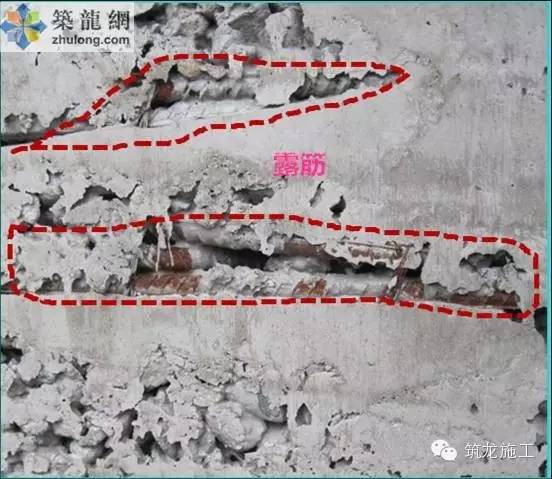 在钢筋混凝土浇筑过程中振捣不到位,保护层垫块没有设置或者固定不牢固,混凝土坍落度小,或拆模早,混凝土硬化前受外力导致剥落而使构件成型后钢筋外露的现象。