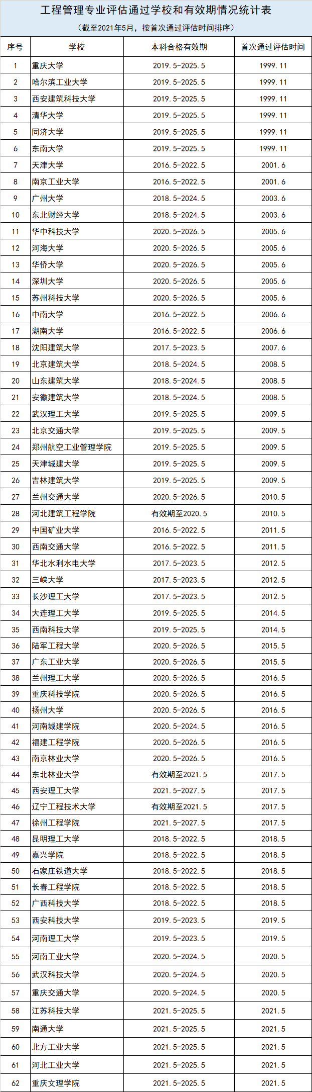6、 工程管理专业评估通过学校和有效期情况统计表(截至2021年5月,按首次通过评估时间排序)