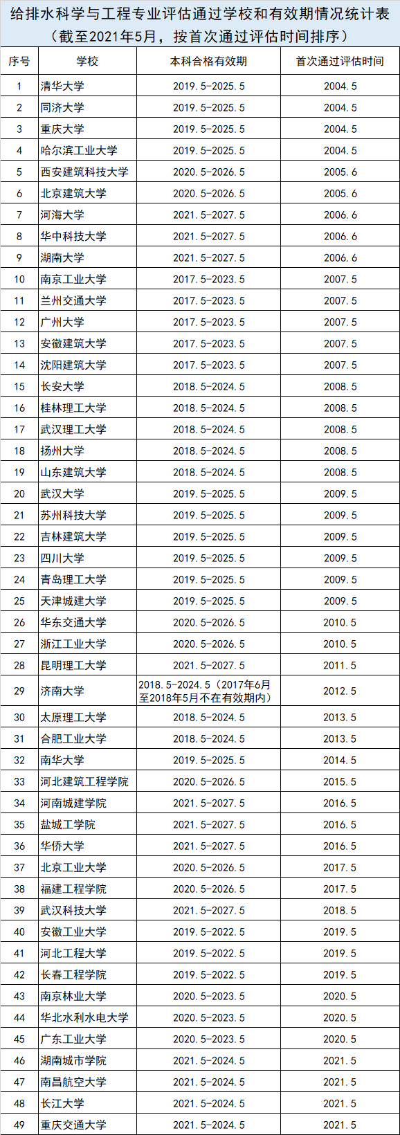 4、 给排水科学与工程专业评估通过学校和有效期情况统计表(截至2021年5月,按首次通过评估时间排序)