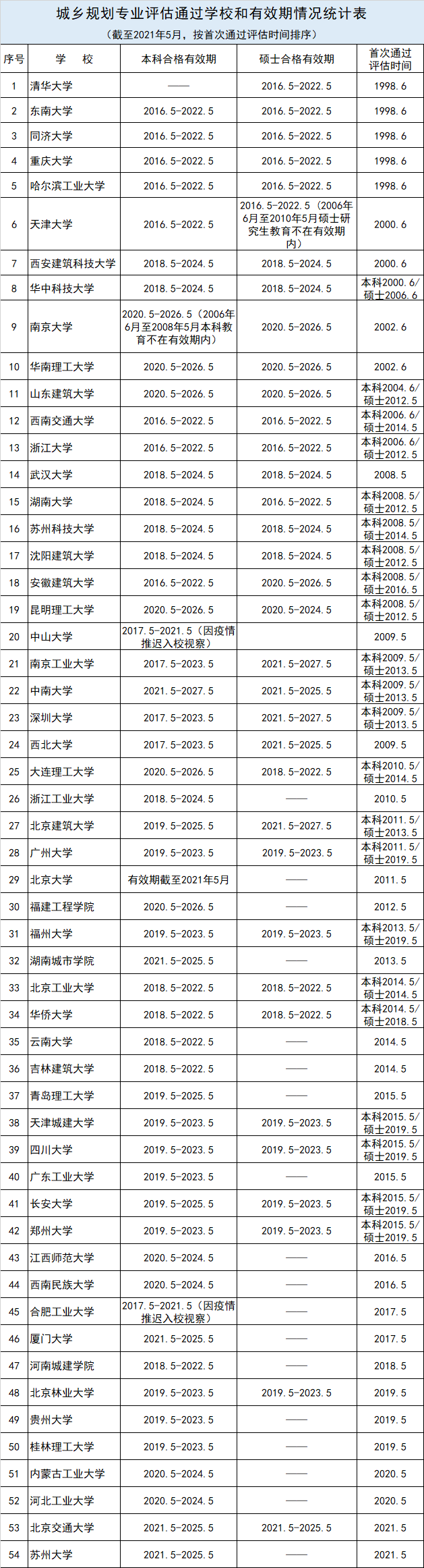 2、 城乡规划专业评估通过学校和有效期情况统计表(截至2021年5月,按首次通过评估时间排序)