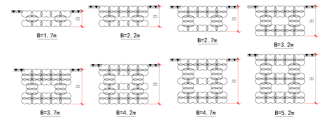 若场地条件限制无法满足大放坡开挖的需要,可采用土钉墙支护,减少放坡范围。1、土钉形式有钢管土钉和钢筋土钉,坡面采用钢筋网片喷射混凝土面层;2、当土钉墙后存在滞水时,应在含水层部位的墙面设置泄水孔或采取其他疏水措施,减小墙背后的水压力,提高土钉墙稳定性;3、当采用预应力锚杆复合土钉墙时,预应力锚杆应采用钢绞线锚杆,且锚杆应布置在土钉墙的较上部位;当用于增强面层抵抗土压力的作用时,锚杆应布置在土压力较大及墙背土层较软弱的部位。1、重力式挡墙形式:一般选用双轴或三轴水泥土搅拌桩,搅拌桩可按搭接施工,搭接长度控制在150mm~200mm,挡墙顶面宜设置混凝土面板;2、一般土层条件下,搅拌深度小于16m的应优先选用造价更低的双轴,超过16m的应选用三轴,遇到淤泥等软弱土层,水泥掺量适当提高;3、水泥土搅拌桩应按格栅布置,建议格栅布置形式如图所示(以双轴为例)。1、一般选用双轴或三轴搅拌桩,搅拌桩兼作止水帷幕应按套打一孔施工,确保止水效果;2、一般型钢租赁期应控制在6个月以内,当租赁期超过6个月,型钢租赁成本较高,目前租赁市场主要型钢类型为H400×400、H500×200、H700×300、H800×300等,可选用插一跳一、插二跳一、密插形式,墙体刚度依次增强;3、型钢应做减小阻摩处理,方便地下室结构完成后型钢拔除回收。1、当基坑开挖面涉及地下水时,应在灌注桩外侧设置隔水帷幕;2、帷幕选型:若隔水帷幕深度小于16m,建议采用造价较低的双轴;若帷幕深度超过16m或者浅层存在深厚密实砂层,建议采用止水效果更好的三轴;3、帷幕深度:对于仅需坑内疏干降水的基坑,软土地区粘性土弱透水层中隔水帷幕深度应控制在基坑基底以下6~7m即可(如上海地区项目);若遇粉性、砂性土等(较)强透水层,且含水层厚度适中、底埋深不深,可考虑帷幕隔断该含水层(如南通、武汉沿江地区);若基坑基底承压水稳定性不满足要求需降承压水,且承压含水层厚度不厚、层底埋深不深,隔水帷幕也应尽量隔断承压含水层,以减少降压降水对周边环境的沉降影响;4、为避免支护结构的浪费,可利用原本在基坑完成后通常废弃的围护排桩作为正常使用阶段主体地下结构一部分,形成“桩墙合一”,围护桩可承担大部分的土压力,减小地库外墙受力,可有效减小地下室外墙厚度、边桩数量,增大地下室建筑面积,实现节能降耗,具有较好的经济效益。软土地区三层地下室以上的基坑采用“两墙合一”地墙较排桩方案较为经济。所谓“两墙合一”即在基坑工程施工阶段地下连续墙作为围护结构,起到挡土和止水的目的;在结构永久使用阶段作为主体地下室结构外墙,通过设置与主体地下结构内部水平梁板构件的有效连接,不再另外设置地下结构外墙。地下连续墙的常用厚度为600mm、800mm、1000mm、1200mm。2、当浅层分布有粉性土或砂性土较厚时,地墙两侧可适当采用水泥土搅拌桩进行槽壁预加固。原则上搅拌桩深度只需覆盖粉性土或砂土层即可,避免在无加固条件下进行地墙槽段成槽施工(否则在无槽壁加固条件下进行成槽施工,容易造成地墙充盈系数过大而大量增加混凝土浇灌量,后续超灌混凝土的凿除量较大也会增加成本);3、地墙成槽泥浆护壁:应优先选用自然造浆泥浆护壁成槽,若自然造浆无法满足成槽要求,再选用人工造浆;4、地墙槽段施工槽段外侧可设置高压旋喷桩进行接缝加强止水,墙内侧应设置扶壁柱、排水沟结合构造砌体墙的防渗构造措施。以上内容来源于网络收集整理,如有侵权请联系客服