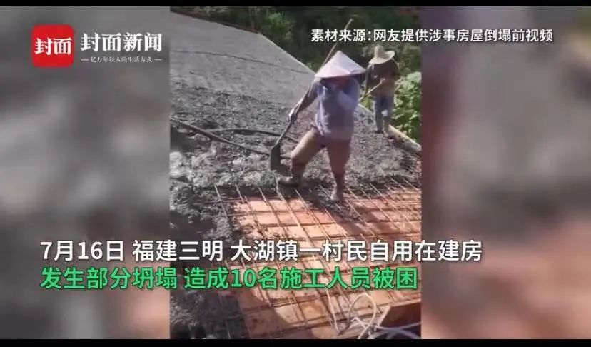 源自丨永安市人民政府、极目新闻、环球时报、我们视频、青蕉视频、建筑管理 据福建永安市人民政府网站消息,7月16日下午,永安市大湖镇冲一村一处村民自用在建单层建筑屋面发生部分坍塌,造成正在屋内休息的10名施工人员被困。 经全力组织抢救,截止晚上8时30分左右,被困人员全部救出,送永安总医院抢救,其中4人送医途中不治死亡,4人在医院抢救无效身亡,2名伤者目前生命体征平稳。目前善后工作已全面展开,房屋坍塌原因正在调查中。 7月17日中午,冲一村邻村多位村民告诉极目新闻记者,出事的房屋只建了一层。该村民告知了极目新闻记者事发房屋施工监工的抖音号,并称该监工也遇难。 据该抖音账号7月16日上午发布的现场施工视频显示,该房屋位于山脚下,有6个施工人员正在房顶浇筑混凝土。随后,极目新闻记者通过私信联系该抖音号,截至记者发稿,尚未收到回复。