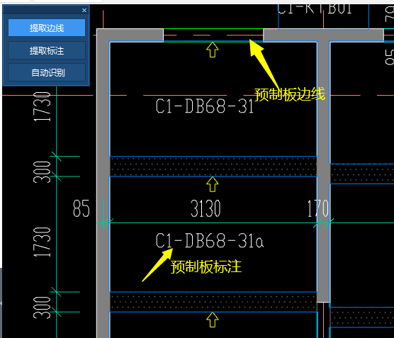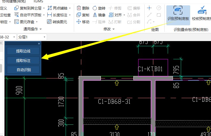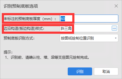 最后,确认预制底板的厚度、边沿构造样式等信息,点击“识别”即可完成识别预制板的整个流程,紫色板块为识别到的预制板。