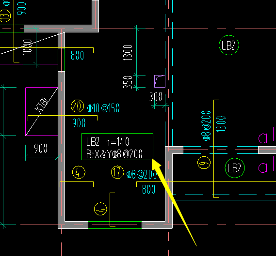 一看板平面布置图。从板平面图中可以看出LB2厚度为140mm,配双向C8@200的底筋,面筋为支座负筋。