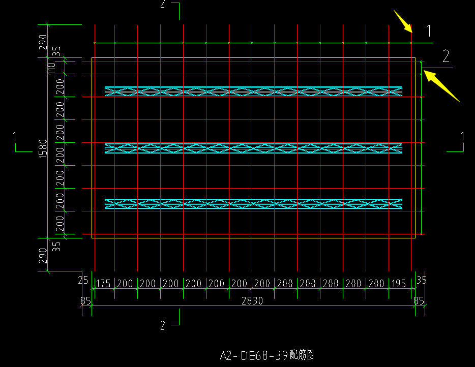 预制板间的板缝为现浇,板缝钢筋为现场绑扎。上图二中板缝宽≥200(具体宽度看“水平向预制构件平面布置图”),无板缝钢筋(板缝处粉色钢筋为预制板出筋)。而图三中板缝钢筋为箭头所指的三根钢筋,配筋同同向预制板筋。