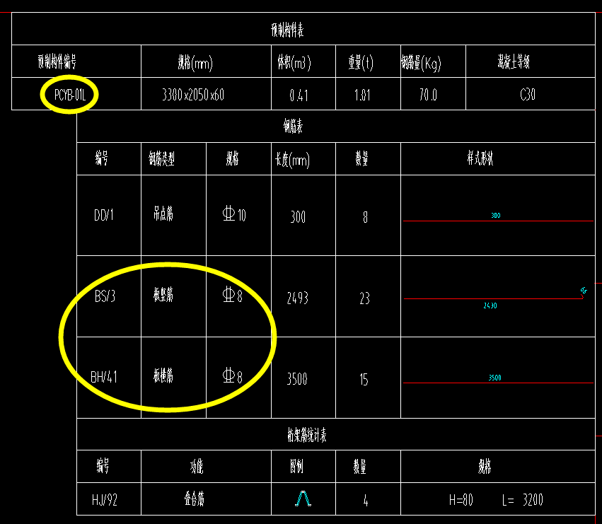 一看结构平面图。从结构平面图中的说明可以获取到黄圈中特殊标记的板为PC叠合板,整个板厚为130mm,配筋为C8@150双层双向拉通配置。PC叠合板的钢筋是怎样的,还要进一步分析预制板深化图。