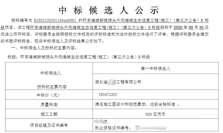 环东海域新城琼头外侧海域生态修复工程B标段于2020年9月30日开标,该工程招标控制价6.26亿元,采用最低价中标法确定中标人,湖北XX工程有限公司以1.9亿元中标。