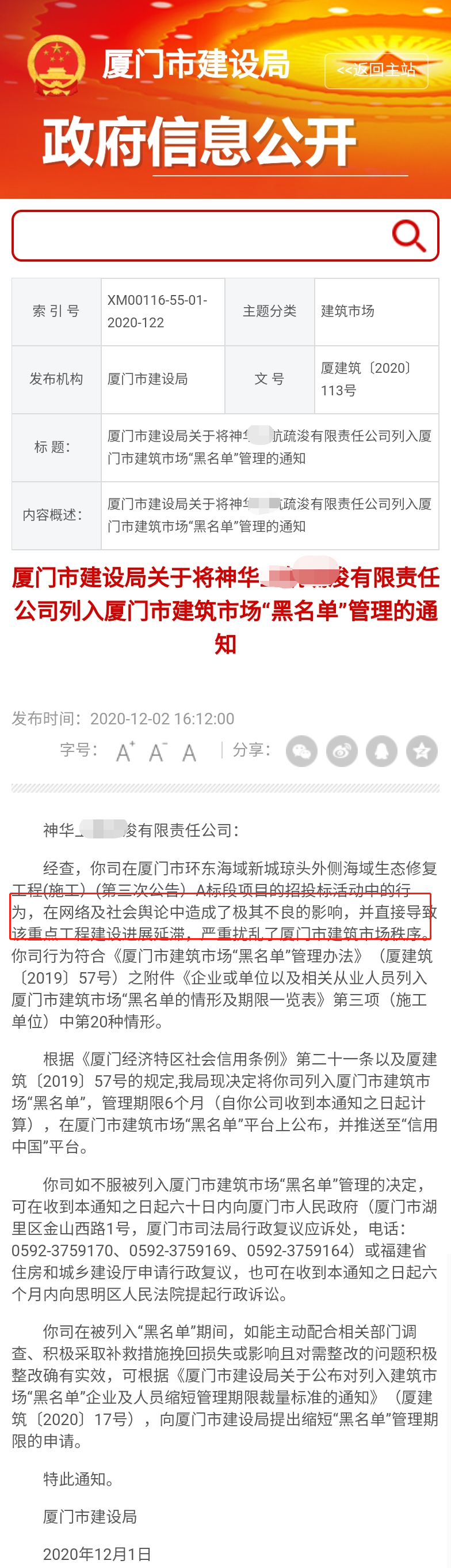 2020年11月12日招标人发出中标通知书,并约谈中标人湖北XX工程有限公司,该公司多次承诺将按照招标文件规定按时履约。中标通知书发出三十日后,湖北XX工程有限公司无正当理由不与招标人订立合同,直接导致项目重新招标,招标人已没收其投标保证金80万元。2021年4月22日厦门市建设局官网通报,将湖北XX工程有限公司列入厦门市建筑市场“黑名单”。官网通报截图: