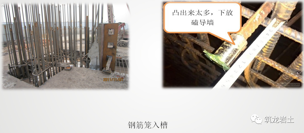 ◆ 监测所需预埋的如测斜管、声测管、土压力计等设备在地连墙钢筋笼制作时进行合理布设,避免与后续混凝土导管冲突,所有外露的缆线必须穿设套管固定并包裹严密,防止在钢筋笼吊装、浇筑砼过程中产生移位、管内进浆导致监测工作无法进行。◆地下连续墙的钢筋接驳器是连续墙钢筋施工的同时,根据以后地下结构楼板的标高要求,为以后地下连续墙和楼板整体连接而预埋在地下连续墙钢筋笼上的接驳件,基坑开挖后,预埋的接驳器普遍存在接驳器锈蚀、丝牙破坏、方位角偏差大造成接驳器和结构主筋无法连接、拧不到位、连接困难等状况,造成部分接驳器无法和主体结构的钢筋连接,影响结构墙板的整体性,常常需要另行植筋再连接。