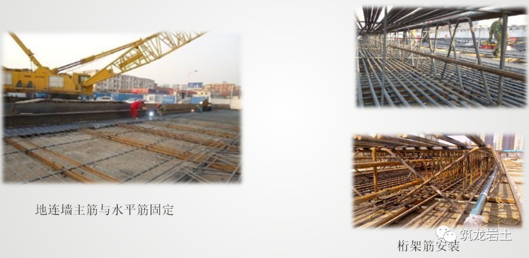 在钢筋笼下设时,对准槽段中心轴线,吊直扶稳,缓缓下沉,避免碰撞孔壁。下节钢筋笼下到孔口时,采用加强的槽钢将钢筋笼的加强顶部稳固住并架立在导墙上。然后起吊上节钢筋笼,竖直后,使上、下节各主筋一一对上,用U型卡扣进行连接。在钢筋笼接近至预定高程时,检查笼体平面位置,如超出标准,则进行调整。当钢筋笼下设到预定高程时,用槽钢将钢筋笼架立在导墙上,并用水准仪校准槽钢的顶面高程,确保在同一个水平面上。1、钢筋笼加工场地和制作平台应平整,分节制作的钢筋笼在同胎制作时应试拼装,采用焊接或机械连接,主筋接头搭接长度应满足设计要求,搭接位置应错开50%。三级钢及Φ25以上的二级钢应采用机械连接。 2、钢筋笼起吊桁架应根据钢筋笼起吊过程中的刚度及整体稳定性的计算结果确定。3、钢筋笼主筋交点应50%并应均匀分布点焊,主筋与桁架及吊点处应100%点焊。4、钢筋笼应设保护层垫板,纵向间距为3m~5m,横向设置2块~3块;定位垫板宜采用4mm~6mm厚钢板制作成“”型,与主筋焊接。1、吊车的选用应满足吊装高度及起重量的要求,主吊和副吊应根据计算确定。2、钢筋笼吊点布置应根据吊装工艺和计算确定,并应进行钢筋笼整体起吊的刚度等安全验算,按计算结果配置吊具、吊点加固钢筋和吊筋等。吊筋长度应根据实测导墙标高确定。3、钢筋笼起吊前应检查吊车回转半径600mm内无障碍物,并进行试吊。4、钢筋笼吊放时应对准槽段中心线缓慢沉入,不得强行入槽。5、钢筋笼的迎土面及迎坑面朝向应正确放置,严禁反放。7、异形槽段钢筋笼起吊前应对转角处进行加强处理,并随入槽过程逐渐割除。