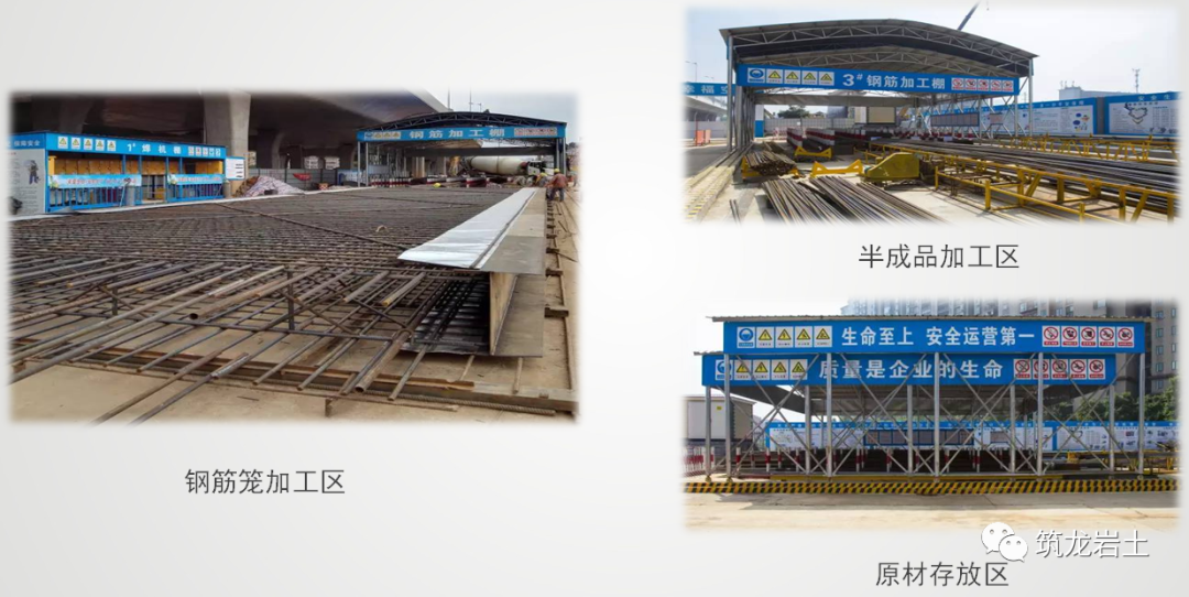 为了尽量减少泥浆系统的占地面积,采用泥浆筒仓与现筑泥浆池相结合的泥浆系统,泥浆的拌制、筛滤和循环主要在泥浆池中完成,储存主要靠泥浆筒仓。泥浆筒仓分为 2 个相互不联通的系统,筒仓组 A 存放成槽泥浆,筒仓组B 储存的泥浆专门用于清底换浆。地连墙钢筋笼加工区原则上设立在地连墙成槽区附近,便于钢筋笼的运输和安装。加工场地在压实原地面的基础上,铺设碎石,浇筑混凝土面层。加工场地尺寸按照最长幅段钢筋笼尺寸设置,钢筋笼以单元槽段为单位整体加工,场地能同时加工两个槽段的钢筋笼。在钢筋加工场地附近设置原材料存放区、半成品加工区、钢筋笼堆放区。