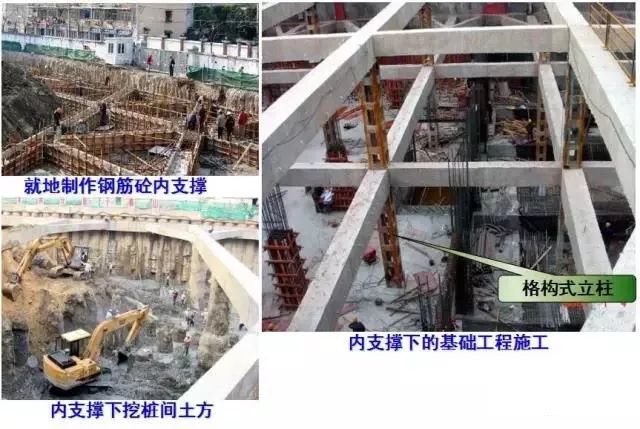 平面尺寸大的内支撑应在交点处设置立柱,立柱宜为格构式柱,以免影响底板穿筋,立柱下端插入工程桩内≮2m,否则应设置专用的桩基础。