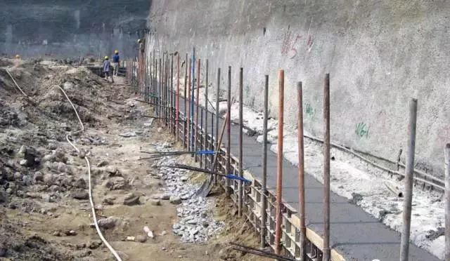 5)挂钢筋网、喷射砼面层:钢筋网通常直径Φ6~10、间距200~300mm,与土钉连接牢固。钢筋与第一层喷射砼的间隙≮20mm。设置双层钢筋网时,第二层钢筋网应在第一层钢筋网被覆盖后铺设。砼面板厚度50~100mm。