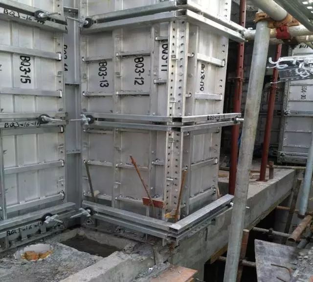 第一道和第三道背楞上加装可调斜撑,用来调整墙面竖向垂直度,采用膨胀螺栓固定在楼板上,稳固,方便。斜撑间距根据墙面长度来定,间距应≤1800mm。