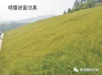 4)液压喷播种子层:将混合种子、粘合剂、肥料、保水剂、木纤维和水等按一定比例配制成的粘性浆体,通过高压,直接喷送至边坡上。喷下的种子泥浆应当具有良好的附着力及明显的颜色,不遗漏、不重复且均匀。