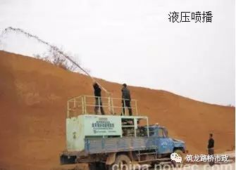 2)液压喷播种子:把水加到物料罐的1/3处,打开循环压力泵,加入木纤维、草籽进行循环搅拌,随着罐内水量加大再加入粘合剂和保水剂进行搅拌。罐内水加满后,加入肥料,将罐体内的浆料持续搅拌5~10min。保水剂应充分吸收水分后待用。喷播时,由高向低进行喷播,握紧喷头,左、右方喷洒,喷洒幅宽5~6m,幅高1m,喷播接茬时应压茬不小于40cm。