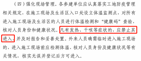 一、各建筑业企业要按照省住建厅《关于进一步做好建筑工地疫情防控工作的紧急通知》要求,严格落实疫情防控各项措施,对在建项目全面实施全封闭管理,不使用近期外来务工人员,最大限度减少建筑工地现场人员外出流动。全面落实工人实名制管理,对所有进入施工现场及生活区的人员进行体温检测和安康码查验,核对人员身份、健康状况和等级,落实“一人一档”等各项制度。