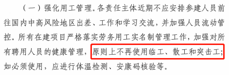 8月3日,合肥市住建局在发布的《关于做好建筑施工领域疫情防控管理工作的通知》中提出:原则上不使用临工、散工和突击工,不使用近期外来务工人员。