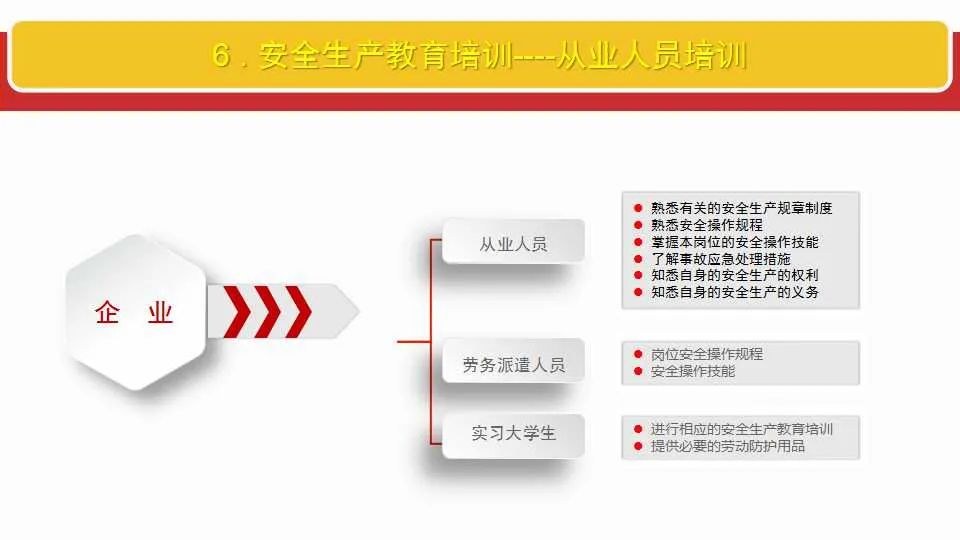 企业应根据工作岗位的性质、特点和内容,明确各岗位的责任人员、责任范围、责任清单,制定从企业主要负责人到一线从业人员的安全生产职责,细化通俗易懂、便于操作的生产车间、班组、一线从业人员安全生产责任,实现企业安全生产责任全员全岗位全覆盖、安全生产责任全过程追溯。加强企业安全文化建设,将安全文化阵地向一线班组和工作现场延伸,强化员工安全生产意识。企业应严格按照国家安全培训规定要求,采取“送出去学、请进来教”等形式,加强对从业人员的安全生产理论教学与实践技能培训,并记入教育培训考核档案。高危行业企业应抓好在岗员工安全技能提升培训、新上岗员工安全技能培训、班组长安全技能提升培训等。通过经常性的教育培训,使企业负责人和安全生产管理人员具备与岗位相适应的安全生产知识和管理能力,使特种作业人员具备特种岗位作业的专业技能,使班组长(工段长)、车间主任具备一线岗位安全管理的知识和能力,使一线从业人员具备本岗位安全生产和应急处置的基本知识和安全操作技能。未经安全生产教育培训合格的从业人员,不得上岗作业。特种作业人员必须按照国家有关规定经专门的安全作业培训并取得相应资格,方可上岗作业。