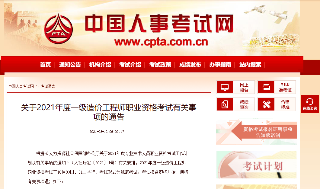 根据《人力资源社会保障部办公厅关于2021年度专业技术人员职业资格考试工作计划及有关事项的通知》(人社厅发〔2021〕4号)有关安排,2021年度一级造价工程师职业资格考试于10月30日、31日举行,考试形式为纸笔考试。考试报名即将开始,现将有关事项通告如下。