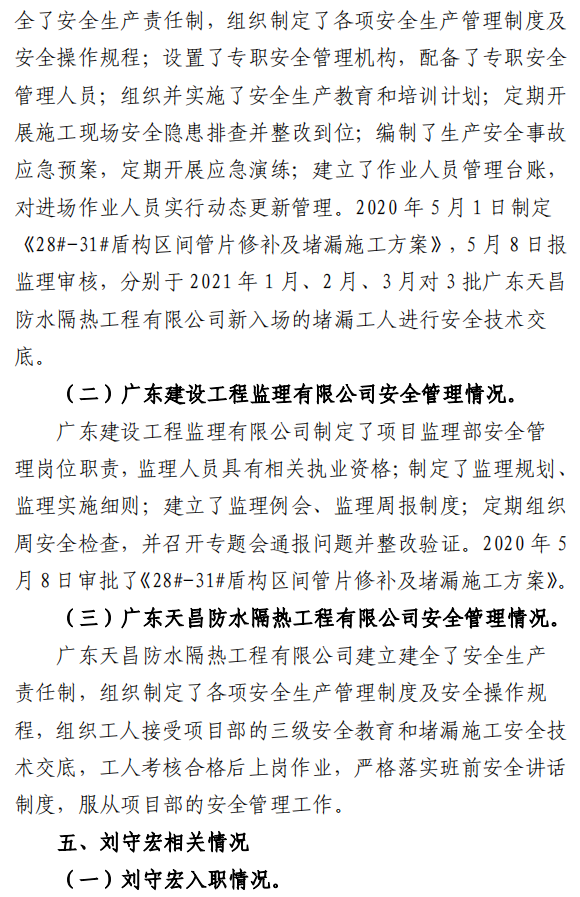 2020年5月1日制定《28#-31#盾构区间管片修补及堵漏施工方案》,5月8日报监理审核,分别于 2021 年 1月、2 月、3 月对 3 批劳务分包单位新入场的堵漏工人进行安全技术交底。