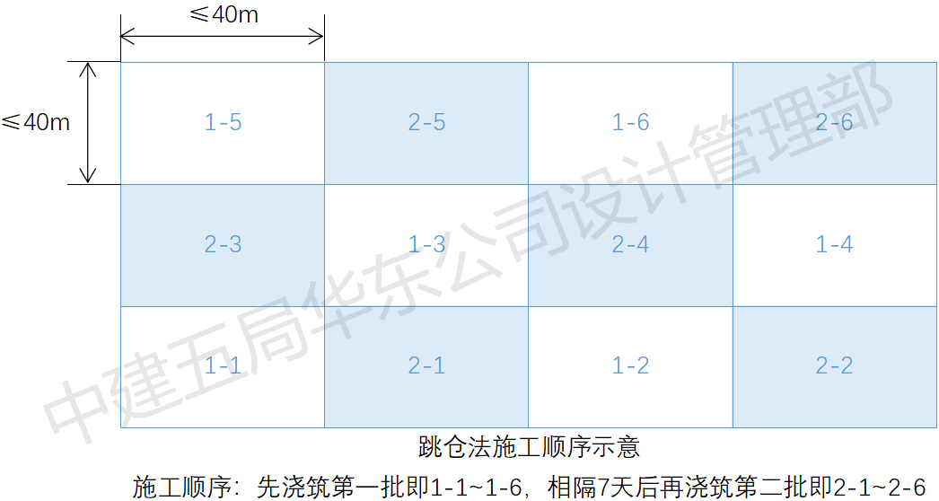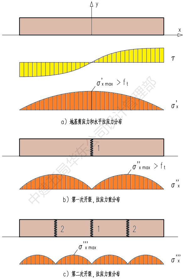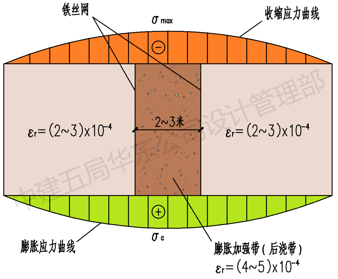 何为EPC的设计成本控制,设计管理者希望用数据指标来控制建筑造价,系统化分析设计成果的经济性,让设计对比更直观,让繁杂问题更简单。中建五局华东公司设计管理部设置专栏——【设计创新工作室】,定期解读设计问题,开启设计新思维。 ” 工作室/ 设计创新 万物互连,让知识传递; 求真务实,让数据说话。 ” 超长结构混凝土温度裂缝防控措施 (上篇)预防混凝土温度裂缝的“放” 人的皮肤受多变气候影响容易干燥开裂,混凝土结构也一样如此,高温、日晒、干燥等不利环境都会导致结构开裂。初秋悄然而至,早晚温差逐渐变大,正如肌肤需要保养一样,混凝土也需要防裂。本期创新工作室来谈谈超长混凝土结构温度裂缝的成因和防治措施。 引言 混凝土裂缝有很多种,主要有收缩裂缝、温度裂缝、沉降裂缝和结构裂缝。有调查显示,目前已建工程中出现的裂缝有95%左右是属于温度裂缝、收缩裂缝、沉降裂缝等非荷载裂缝,结构裂缝仅占5%。那么,日常防治裂缝的工作重点首要就在于防治温度裂缝。 那么温度裂缝是怎么产生的呢?为什么超长混凝土容易产生温度裂缝呢?温度裂缝的防治措施是什么?今天带着这些问题,我们开始以下的分析。 温度应力和其影响因素 01 温度裂缝的产生是因为温度应力大于混凝土的极限抗拉强度,导致混凝土受拉破坏,要防止出现温度裂缝首先要了解温度应力。温度应力按成因可分为两类: (1)水泥硬化时产生的水化热使混凝土内外温度不均产生应力; (2)混凝土的热胀冷缩受到外部制约,不能自由变形而引起应力。本文主要讨论后者。 为什么超长结构更容易产生温度裂缝呢?首先我们了解下什么是超长结构。《高层建筑混凝土结构技术规程》对超长结构说明如下: 《高层建筑混凝土结构技术规程》(JGJ3-2010) 13.9.1(条文说明) …… 本节所述超长结构,通常指平面尺寸大于本规程规定的伸缩缝间距的结构。 了解了什么是超长混凝土结构,我们再对其进行受力分析。以卧置在地基上的筏板为例,假设同一截面上的应力分布均匀,在地基土的制约下,构件截面上将出现水平法向应力σx和竖向应力σy,其沿构件长度方向的分布如下图所示。 超长混凝土构件的主要应力图 其中σx是引起垂直裂缝的主要应力,是设计控制应力,其最大值出现在构件中点,即x=0 处。σy可能引起水平裂缝,但其值一般很小,可忽略不计。σx max的计算公式为: 其中: E——混凝土弹性模量(MPa) H——板厚(mm) L——结构物的长度(mm) Cx——地基阻力系数(N/mm³) cosh——双曲线余弦函数 α——混凝土线膨胀系数,为1.0e-5/℃ T——综合温差,T=T1+T2-T3 T1——混凝土因水泥水化导致的升温值 T2——混凝土干缩当量温差 T3——混凝土膨胀当量温差 分析式(1)可发现法向最大应力σx的大小与构造和材料两大因素有关,我们把他们记做材料因子M和构造系数S。 σx max = M·S 材料因子分析:混凝土弹性模量E、混凝土线膨胀系数α和混凝土强度等级相关,相对固定,可视为常数;综合温差T和混凝土的配合比相关。 构造系数分析:构造系数S是[0,1]之间的数,当结构长度L、地基阻力系数Cx增加时,构造系数S也会变大。 材料因子和构造系数变大,混凝土法向应力也会变大。根据分析可知,防止温度裂缝的关键在于结构受力约束形式、构件尺寸、混凝土材料。通过控制约束形式和构件尺寸来实现释“放”温度应力,通过调整混凝土材料来实现抵“抗”温度应力。 释“放”温度应力的技术措施 02 分析公式(1)可知,通过合理的构造形式和减少构件尺寸,降低构造系数S的数值,可有效释放结构承受的约束应力。由此思路可引出以下几种“放”的技术措施: 1、设滑动层减阻力 首先我们考虑的是如何减少约束,充分释放温度应力,还是以超长混凝土结构筏板为例。在筏板与地基土之间的防水层上满铺一层10~20mm厚的细砂作为滑动层,以减小底板和地基之间的摩擦系数,释放约束应力。从而让混凝土自由收缩,释放温度应力,避免混凝土开裂。 2、设伸缩缝 缩短结构长度L可减小构造系数S,最终降低混凝土温度应力。因此释放约束应力的另一思路是通过合理分缝设计,降低结构长度,伸缩缝的应用正是基于这一原理。伸缩缝的做法是沿建筑物长度方向每隔一定距离预留永久性结构缝隙,将建筑物从屋顶、墙体、楼层和底板等构件全部断开,缝隙内用防水材料填充。规范(GB50010-2010)规定的钢筋混凝土结构伸缩缝的最大间距如下表所示。 3. 跳仓法施工 缩短结构长度L的方法还有跳仓法施工。“跳仓法”就是把超长、超宽的混凝土结构划分成若干区段,采用间隔浇筑的一种施工方法。如下图所示,按照“分块规划、隔块施工、分层浇筑、整体成型”的原则,如同跳棋一样,隔一段浇一段,相邻两段间隔时间一般不少于7天,来有效释放混凝土在硬化初期剧烈的温度和干燥收缩应力。 4. 设诱导缝 缩短结构长度L的第3种方法是设诱导缝。诱导缝是为了控制混凝土开裂的位置,人为造成薄弱连接面,其做法如下图所示。通过留置诱导缝,当构件的收缩应力大于其抗拉强度时,构件在设定位置有序开裂,开裂后构件的结构长度L减小,释放了收缩应力,从而防止在其他部位继续发生无序的开裂。因其容易产生渗水,只能用于水位低或干燥的地方。 诱导缝结构做法示意 5. 设后浇带 缩短结构长度L的另一种方法是设后浇带。后浇带将结构暂