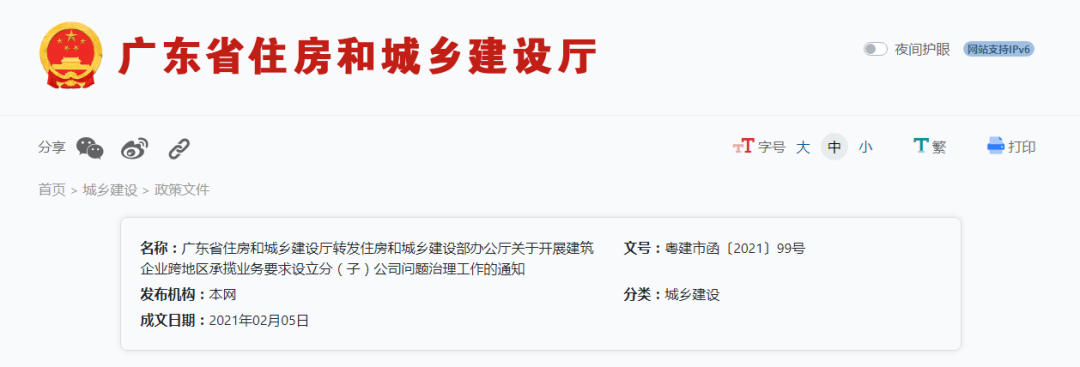 2021年2月,陕西省住建厅转发住房城乡建设部办公厅《关于开展建筑企业跨地区承揽业务要求设立分(子)公司问题治理工作的通知》。