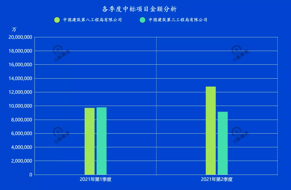 此前基建通大数据有过统计,今年上半年,重大签约项目合同额方面,中建八局和中建三局的独立签约金额十分接近,中建八局和中建三局独立中标项目总金额分别为 2250 亿元、1890 亿元左右,算上以各自为中标联合体主要成员的项目,前者中标额约 2568 亿元,后者约 2005 亿元。另外据悉,上半年中建八局累计新签合同额超3000亿元。