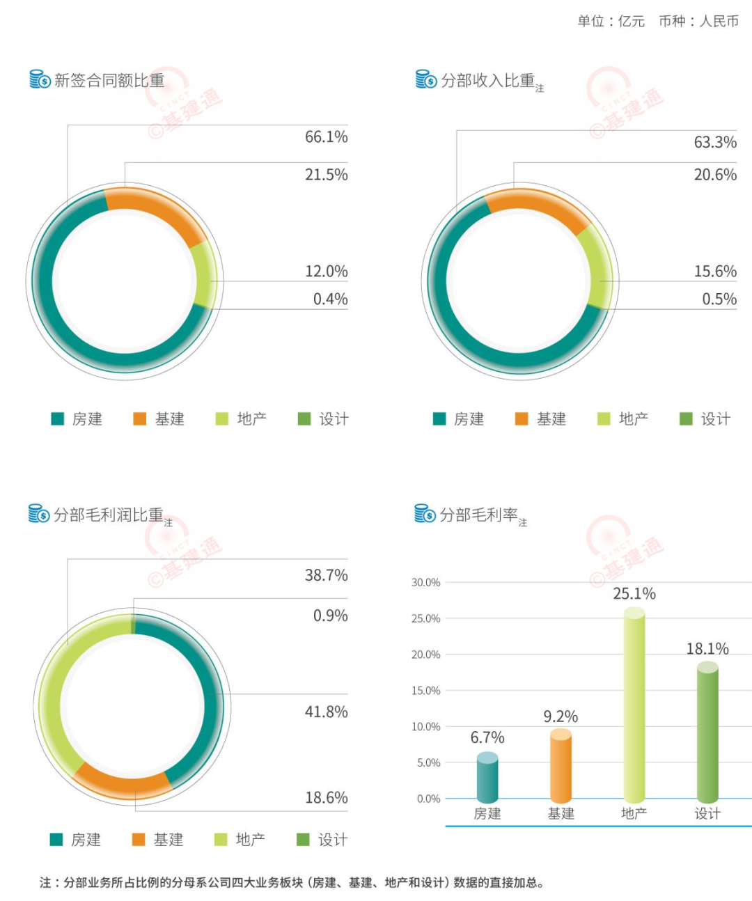 从下图中可以看到,地产业务的新签合同额以及营业收入的占比虽然只有总量的 12%、15.6%,但其毛利率比重却高达 38.7%,仅次于房建业务占比,且相差甚小,其毛利率更是在四大业务中居首位,高达 25.1%。