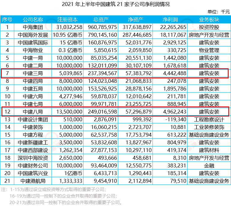 当然,单单只看中标或者签约项目合同额还不够。中国建筑半年报披露了其 21 家子公司在 2021 年上半年的净利润情况,根据官方数据显示,除过以投资控股和房地产开发经营为主业的中海集团与中国海外发展这 2 家单位外,在剩余的 19 家中建系子公司里面,中建八局的净利润额排名第一,约 49.62 亿元,而中建三局净利润额约 44.42 亿元,次于中建八局。