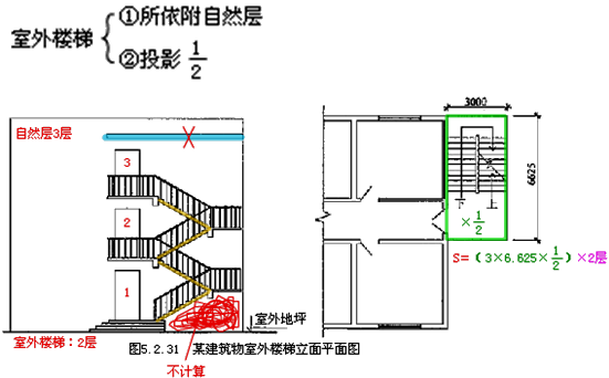 20、室外楼梯应并入所依附建筑物自然层,并应按其水平投影面积的1/2计算建筑面积。