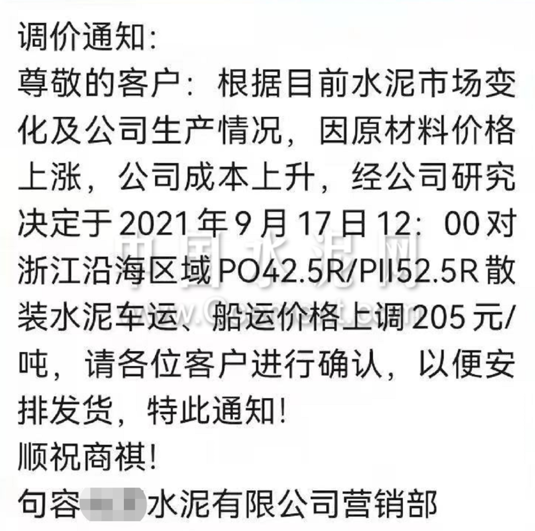 此外,值得一提的是,镇江某水泥大厂9月17日对浙江沿海区域PO42.5R/PII52.5R散装水泥车运、船运价格上调205元/吨,创造了近年来单次涨价最高纪录。